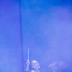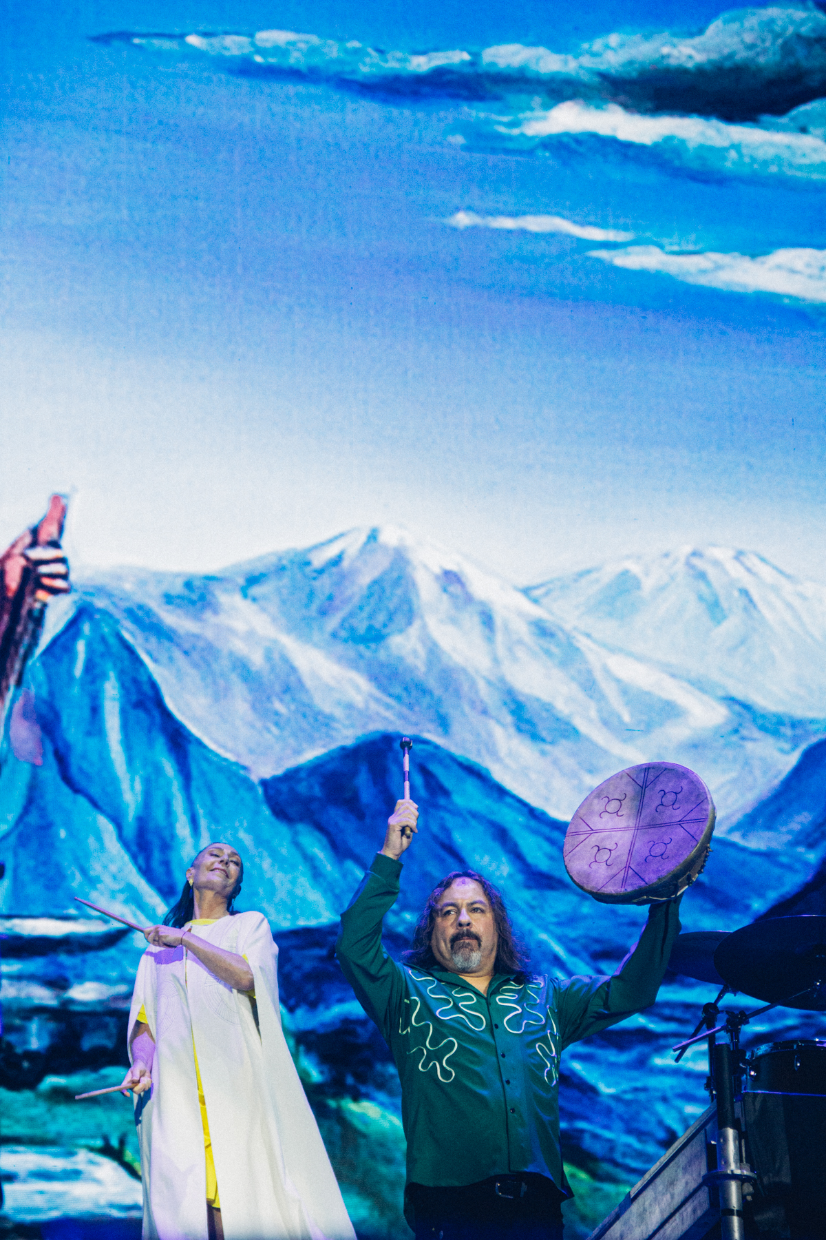Las pantallas mostraban visuales que expandían la obra sin competir con la música y me recordaban a Los Jaivas en el Planetario. La voz de Mario Mutis, impecable, te recorría la piel. La percusión, poderosa, precisa, con una energía casi ritual, Juanita Parra, vibrante en cada golpe, fue literalmente el corazón sonoro del estadio. Claudio Parra, siempre certero, sostuvo el viaje desde los teclados.